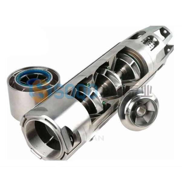 2、潛水泵每級導流殼中裝有一個橡膠軸承;葉輪用錐形套固定在泵軸上;導流殼采用螺紋或螺栓聯成一體。