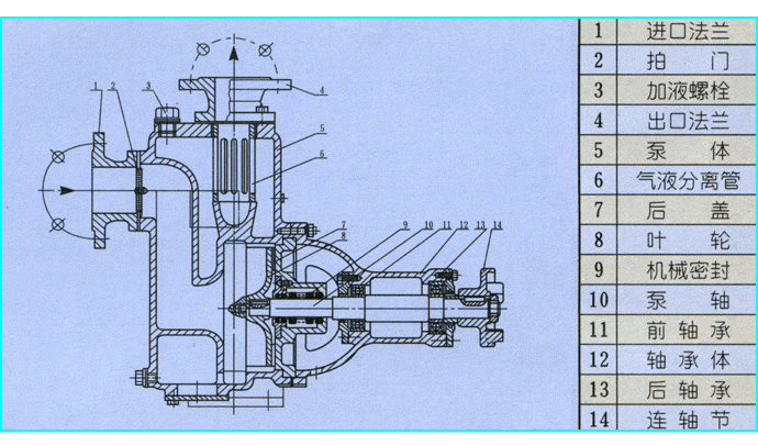 泵的工作原理:泵體內設有儲液腔,并通過上方的回流孔和下方的循環孔與泵工作腔相通,構成泵的軸向加流外混式系統。泵停止工作后,泵內腔已儲有一定容積的液體。當泵起動時,有關當局內的儲液在葉輪的作用下,夾帶著空氣被向上拋出,液體通過氣液分離管的網格回流到工作腔,氣體被排出泵外,使泵內形成一定的真空度,達到自吸的作用。