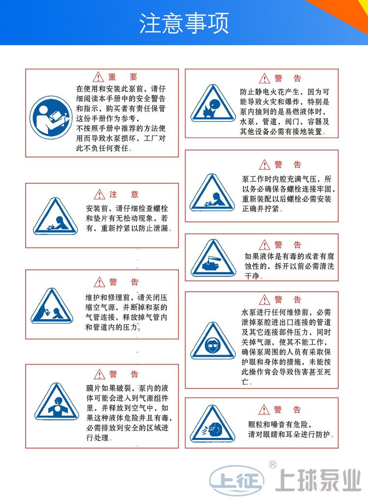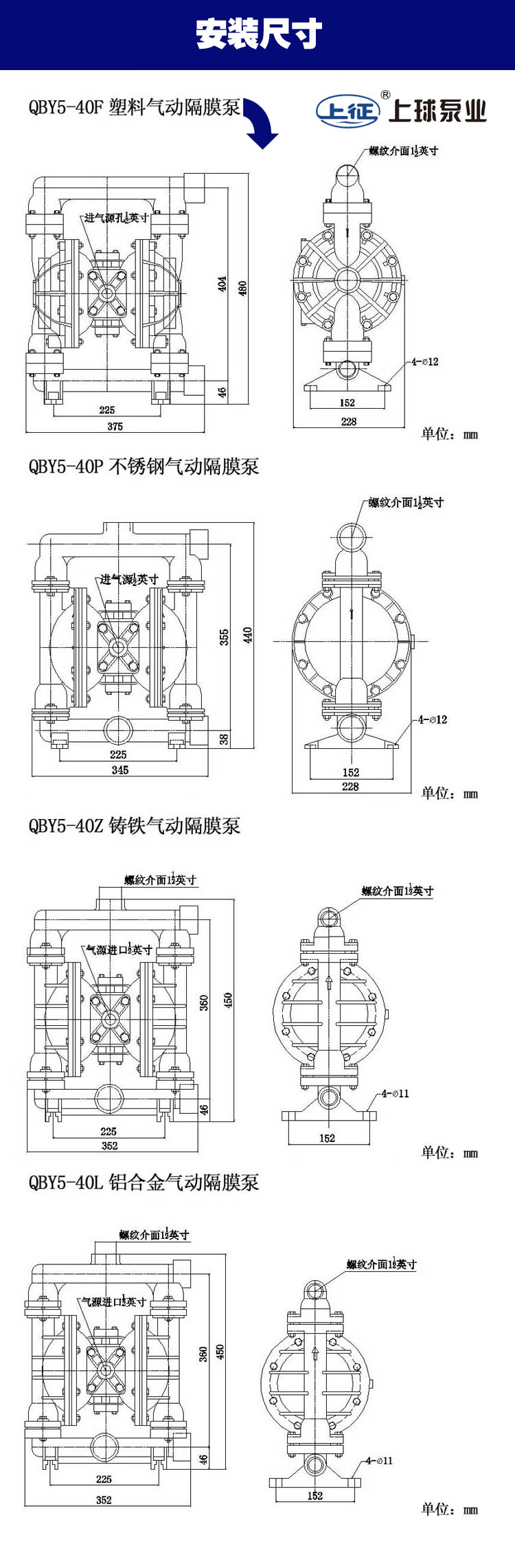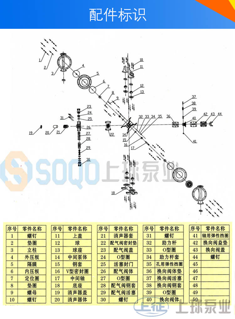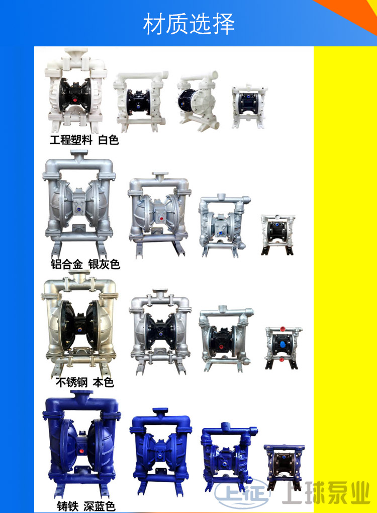 生產(chǎn)的隔膜泵共有十二種規(guī)格。進(jìn)出口尺寸分別為1/4”(10mm)、1/2”(15mm)、3/4”(20mm)、1”(25mm)、1.2”(32mm)1.5”(40mm)、2”(50mm)、2.5”(65mm)3”(80mm)、4”(100mm)流體部件材質(zhì)有:鋁合金、鑄鐵、聚丙烯、不銹鋼、隔膜根據(jù)不同膜片材質(zhì)分別有:丁晴橡膠、氯丁橡膠、聚乙烯、聚膠、聚醚橡膠、氟橡膠、氟塑料、特氟隆。以滿足不同液體介質(zhì)的需要。